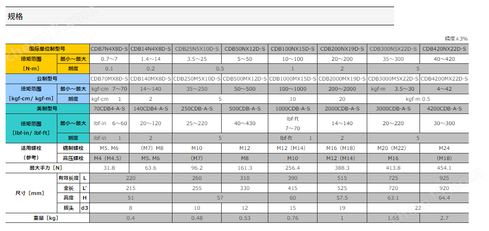 东日TOHNICHI可换头刻度盘式扭力扳手交换头式扭力扳手重量轻,读取刻度容易,适用于检查。通过使用交换头,可将一把扳手,变为开口扳手、梅花扳手、棘轮扳手、内六角扳手以及其他扳手使用。CDB型号的标准附件包含记忆指针,用于获取峰值扭矩读数。由于变形量较小,相对于平板指针式扭力扳手,可以减轻操作人员的疲劳程度 。
